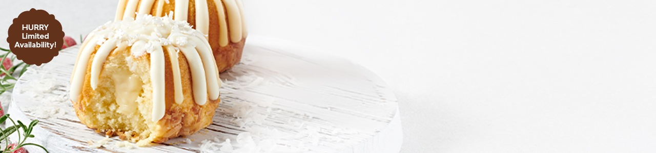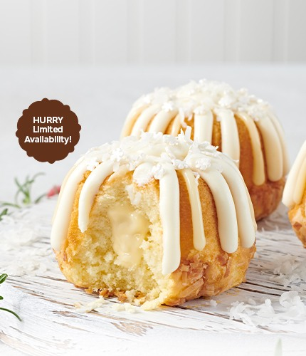Ready for a winter wonderland of flavor? Try our NEW Bundtlet, Coconut Cream Snowflake. Coconut cake, vanilla pudding, coconut flakes and winter snowflake sprinkles make for a cake you'll love. Only available from 12/1 - 12/14, while supplies last, so order today!